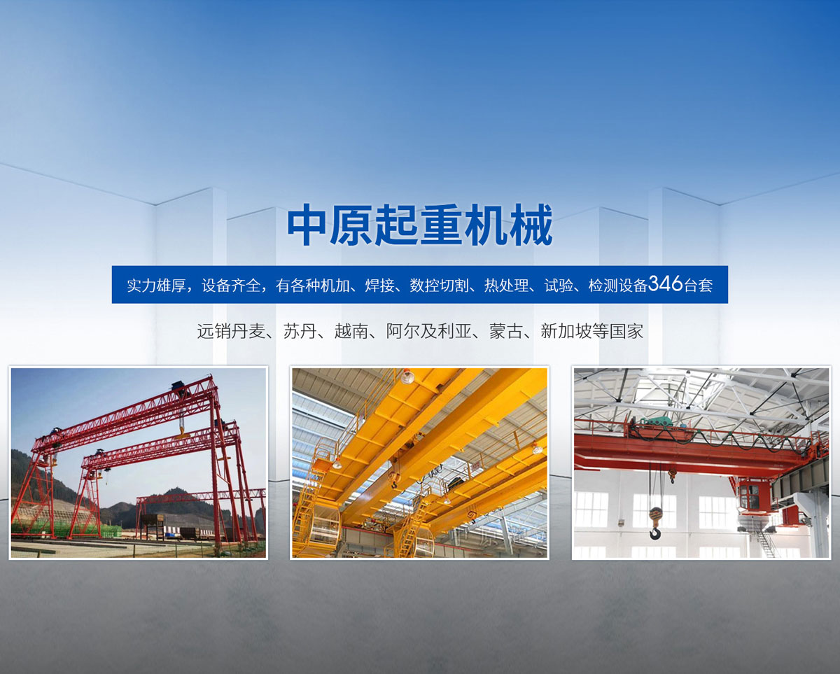 新鄉市中原起重機械有限公司成立于2000年,地處中原,輻射全國28個省市自治區,設外埠經銷處、辦事處268個。產品行銷工礦、建材、化工、冶金、電力、交通、鐵路、油田、港口等各個行業。遠銷丹麥、蘇丹、越南、阿爾及利亞、蒙古、新加坡等國家。  公司實力雄厚,設備齊全,有各種機加、焊接、數控切割、熱處理、試驗、檢測設備7臺;有機加工、熱處理、單、雙梁橋門機生產、檢測、安裝等9個車間,研究中心、運輸公司、安裝維修服務公司等機構,?  主要產品有:LD型1~20噸電動單梁起重機系列產品;5~600噸通用橋式、門式、冶金、上旋轉下旋轉電磁吊、絕緣、抓斗、防爆起重機系列產品;LH3~100噸葫蘆雙梁系列產品;MH5~32噸葫蘆門式系列產品;0.5~40噸CD1、MD1鋼絲繩電葫蘆系列產品;HS1型0.5~20噸手動葫蘆系列產品;0.5~10噸環鏈電動葫蘆系列;0.5~40噸彎道電動葫蘆系列產品;裝卸橋、造船門機、架橋機、鑄造吊和水電大噸位起重機系列產品。  公司建立了強有力的質量保證體系和生產過程的質量控制系統,嚴格執行國家設計、生產標準,有嚴格的生產工藝過程和標準,嚴格的檢驗、檢測標準和手段。